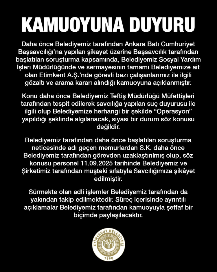 Başkan Beşikçioğlu, söz konusu sürecin belediyenin daha önce yaptığı suç duyurusu üzerine başlatıldığını belirterek, olayın “operasyon” olarak nitelendirilmesinin doğru olmadığını ve herhangi bir siyasi boyutunun bulunmadığını vurguladı. Açıklamada, belediyeye bağlı Sosyal Yardım İşleri Müdürlüğü ile sermayesinin tamamı belediyeye ait olan Etimkent A.Ş.’de görev yapan bazı personeller hakkında işlem yapıldığı ifade edildi. Konunun, belediye Teftiş Müdürlüğü müfettişleri tarafından önceden tespit edilerek savcılığa iletildiği bildirildi.